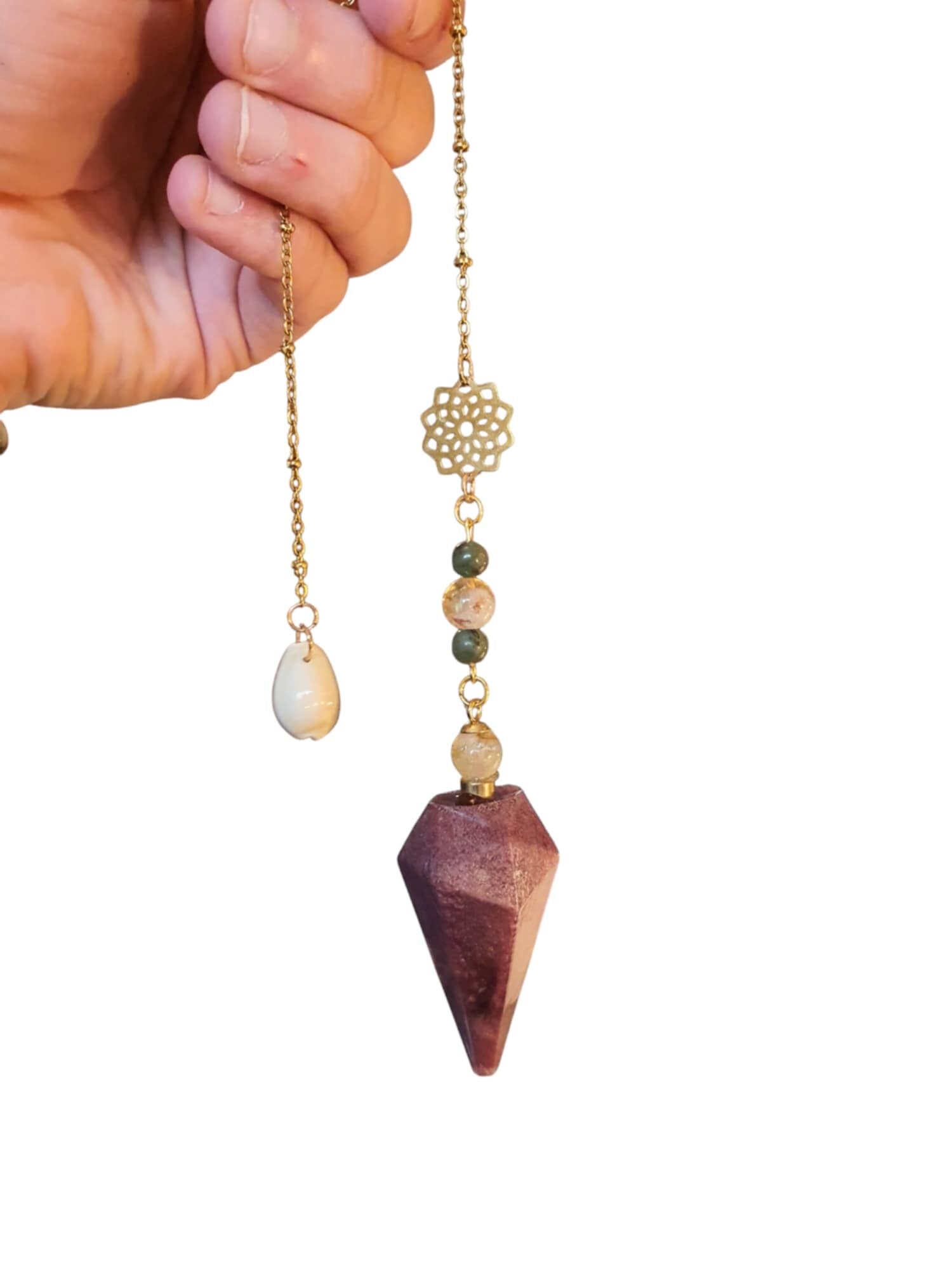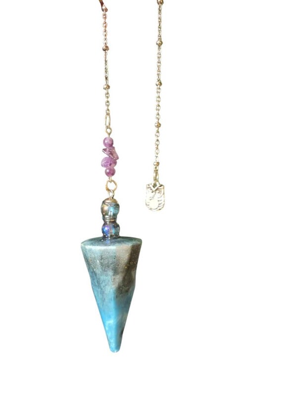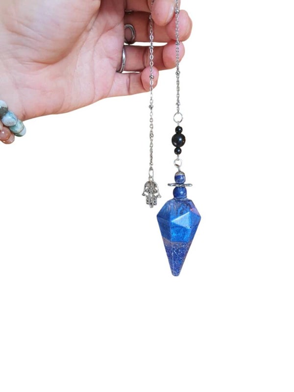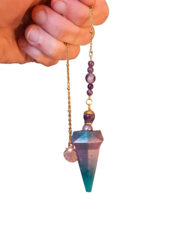Pendules en résine epoxy fait main avec inclusions de fleurs/plantes séchées/colorant poudre et hornés de pierres de lithothérapie. Les chaines sont en acier inoxydable (doré ou argenté). Pendules accompagnés de breloque. Magnétisés, ils sont prêts à l'emploi aussitôt reçus.